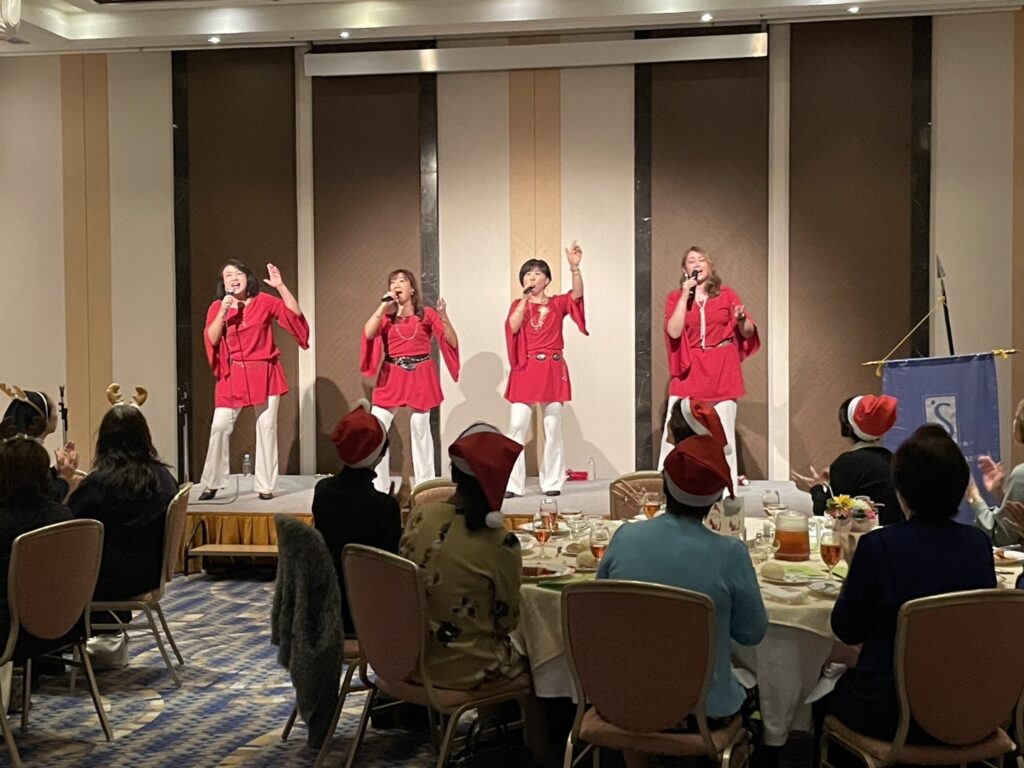 12月15日、12月例会終了後、聖霊学園高等学校工藤保代校長先生を来賓にお迎えしてクリスマス交流会が行われました。いつもよりちょっとグレードアップした美味しいお食事を楽しみながら、工藤先生からはSクラブの活動についてお話しいただき、SI秋田との絆を強く感じることができました。また、余興として秋田市のゴスペルグループ「Sing Along」のミニコンサートではパワフルで美しいハーモニーを楽しみ、クリスマス会らしい楽しい一日を会員ですごすことができました。