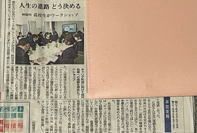 1月11日、秋田市にぎわい交流館AUにて、秋田市内3校(聖霊学園高等学校、市立秋田商業高等学校、公立秋田美術大学付属高等学院)の生徒さん18名が参加した 夢を拓く:女子中高生のための茶話会が開催されました。講師は秋田市でキャリアコンサルタントとして活躍する石田万梨奈さん。失敗を恐れず、トライすることが何よりも大事、と未来を作る高校生にふさわしい充実した内容の2時間でした。当日は男子学生も1名参加し、学校の垣根を超えた交流もあり、参加者には大変好評な茶話会となりました。当日はテレビ局2局、新聞社1社よりの取材もあり、国際ソロプチミスト秋田の活動を多くの方に知っていただくこともでき充実した一日となりました。