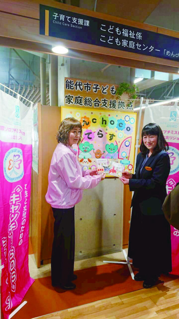 “キャッチ!SOS”キャンペーン「国際女性デー」 2026.3.5 3月5日能代市役所子育て支援課へ乳がん検診グローブと手作りの折り紙をセットにして寄贈しました。 乳幼児健診に訪れた母親に手にとってもらえますように。 とっても市役所の課の方々に喜ばれました。