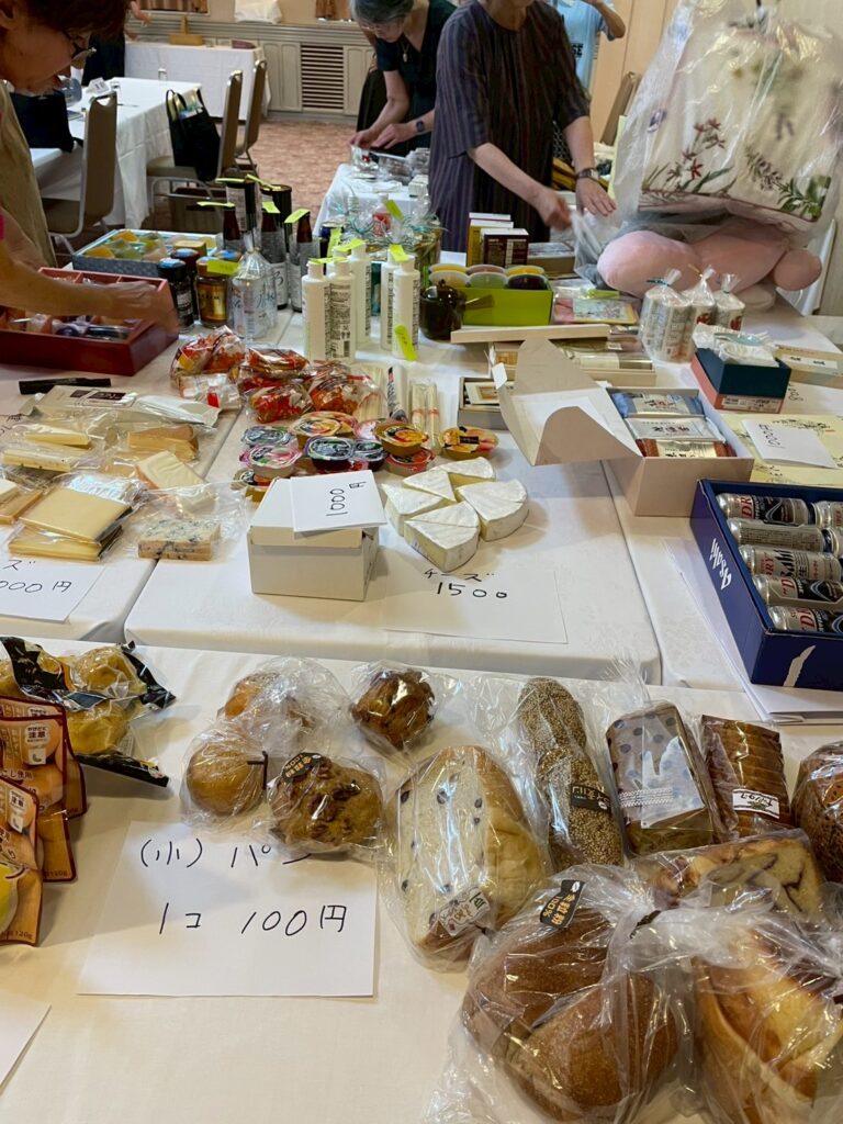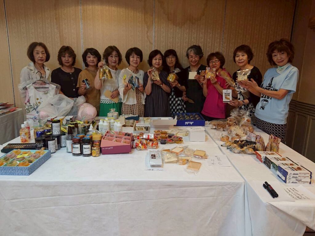 8月例会において、会員間でのプチマルシェを行いました。前もって会員が手に入り易い品物は、注文をとって取り寄せてもらったり、皆が喜びそうな食べ物も各自持ち寄りました。また各家庭に眠っている食器や洋服などたくさんの品物が集まり和気あいあいとした中お買い物を楽しみました。収益は76106円でした