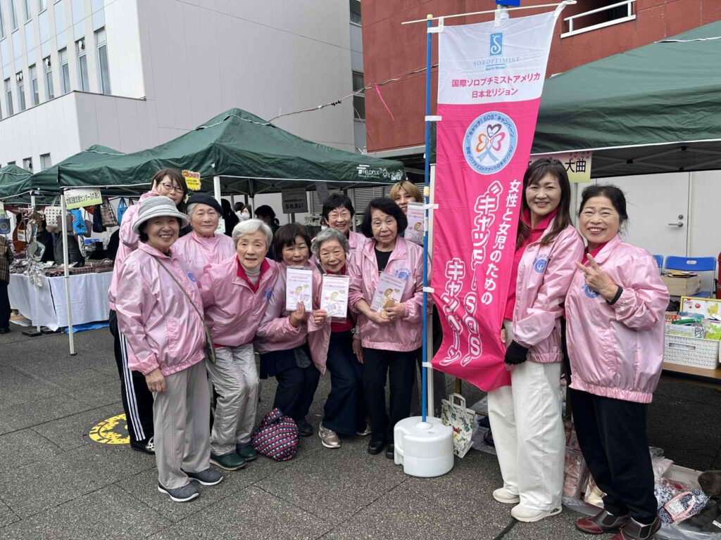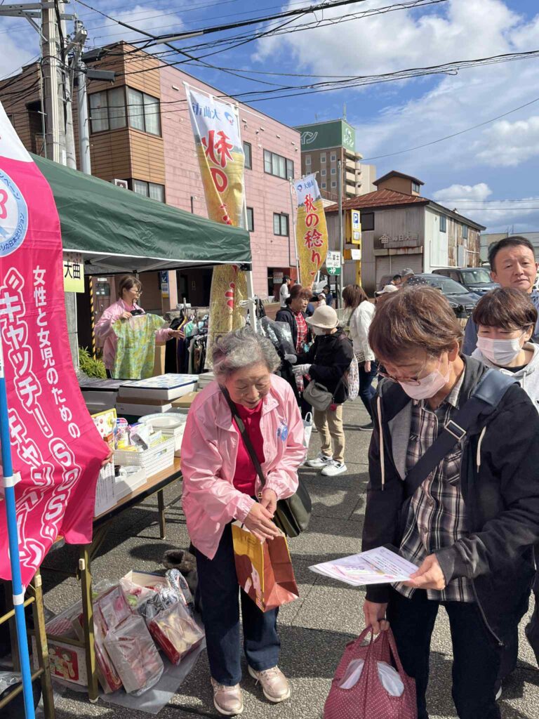 大曲ヒカリオ広場で開催された「秋の稔りフェア」で、国際ソロプチミスト大曲が行うチャリティバザーに合わせ、女性の地位向上委員会(小松さつき委員長)のメンバーを中心に11名が、DV防止リーフレットの配布を行いました。当日は、準備したリーフレットをすべて配布できました。