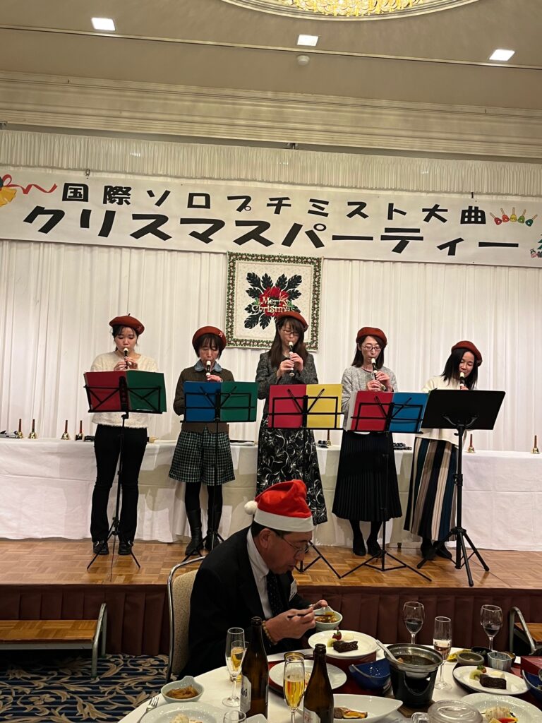 12月17日、川端を会場に、友好団体であるロータリークラブ、ライオンズクラブ等の来賓をお招きして、総勢40名で、ソロプチミスト大曲のクリスマス会が行われました。会場内をクリスマス装飾し、クリスマスモードに。そして、ハンドベル演奏、リコーダー演奏(吹奏楽部経験者有志による)を披露しました。オープニングは、芳田知世会員、芳田和会員(親子で会員)がピアノの連弾でお客様をお迎えしました。また、お客様から、ハンドベル体験をしていただき、「音楽で楽しむクリスマス会」を満喫して喜んでいただきました。「ソロプチミスト大曲」らしい会と好評でした。当日の運営は、教育奉仕委員会と環境保健委員会が担当しました。