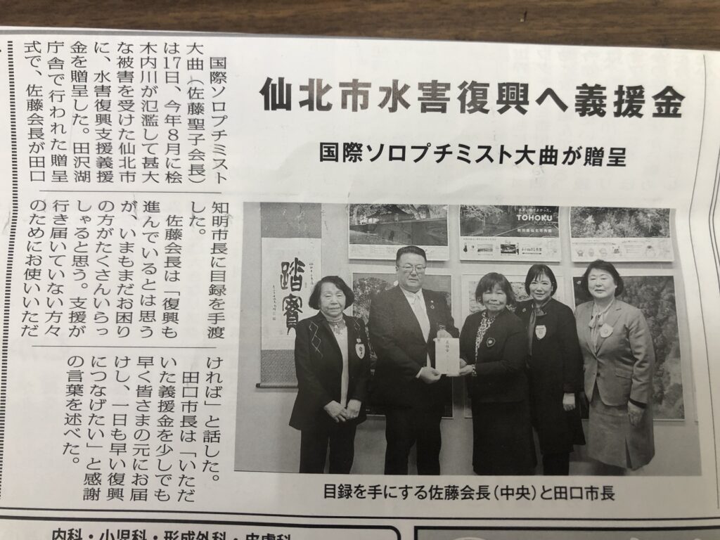 今年8月に仙北市桧内川が大氾濫し、西木地区で甚大な被害を及ぼしました。国際ソロプチミスト大曲では、11月17日に仙北市田沢湖庁舎において、仙北市市長田口知明氏に対して、水害復興義援金を贈呈いたしました。田口市長からは、「国際ソロプチミスト大曲様からは、チャリティコンサートの収益金から児童図書の寄付をいただき、感謝している。今回もありがたく有効に使わせていただきたい」とあいさつがありました。