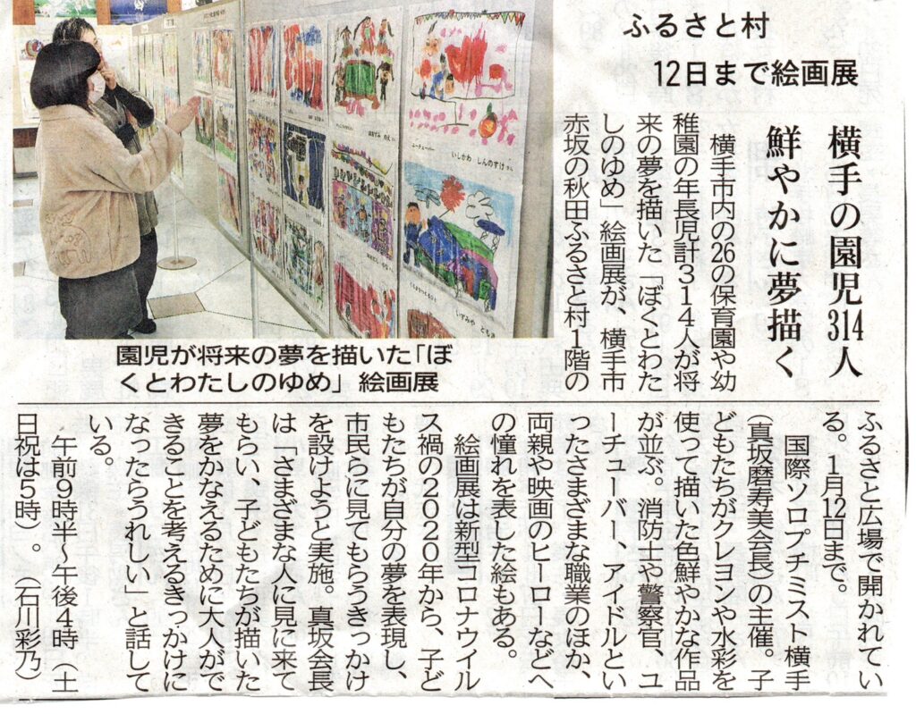 第6回「ぼくとわたしのゆめ」絵画展開催 2025.12.13~2026.1.12 6回目となる「ぼくとわたしのゆめ」おとなになったらなりたいもの絵画展を秋田ふるさと村を会場に1か月間開催いたしました。横手市の26園の年長組314名の大きな夢が集まりました。子供達の作品からは寒さも忘れるパワーをもらいました。