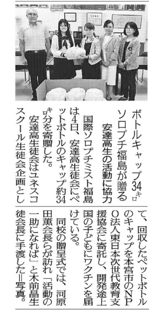 9月4日(木)安達高校にエコキャップ34キロを寄付しました。安達高校はユネスコスクール生徒会企画として、開発途上国の子どもにワクチンを届けるためにエコキャップを集める活動をしています。この活動に賛同して我々も日ごろからエコキャップを回収しているのでキャップを一つ一つ洗って生徒会長に届けました。医療の届かない途上国の一人でも多くの子どもににワクチンが届きますように。