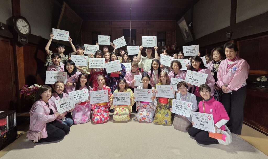 女性に対する暴力撤廃の国際デー 2025.11.24 11月24日に開催された国際交流リンゴ狩りで、出席した福島大学の留学生18名に向け、会員が英語で女性の暴力撤廃について説明しました。皆真剣に話を聞き、話し合いました。気に入ったカードを持って写真を撮りました。