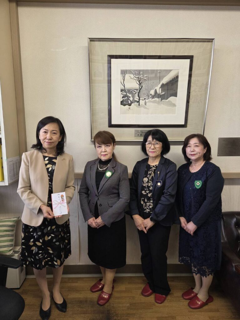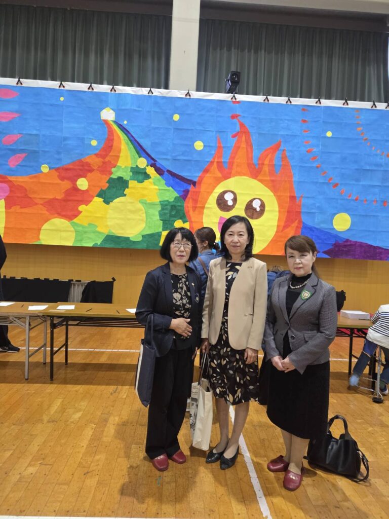 Sクラブの平野中学校へ梨秋祭のお祝い金を届けてまいりました。生徒たちの力作の前で校長先生と写真を撮影させていただきました。当クラブがお届けしているお祝い金は舞台照明器具のステージライトの購入に使っていただいたそうで、今日のステージでも活躍していて、会長、スポンサーシップ委員長は吹奏楽の舞台を見せていただき、感動して帰ってきました。来年も生徒のみなさまの活動に役に立てることを続けていきたいですね。