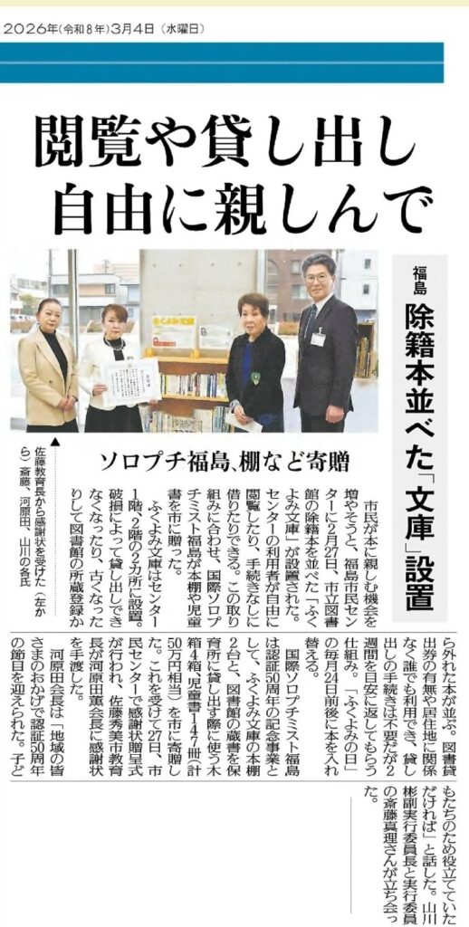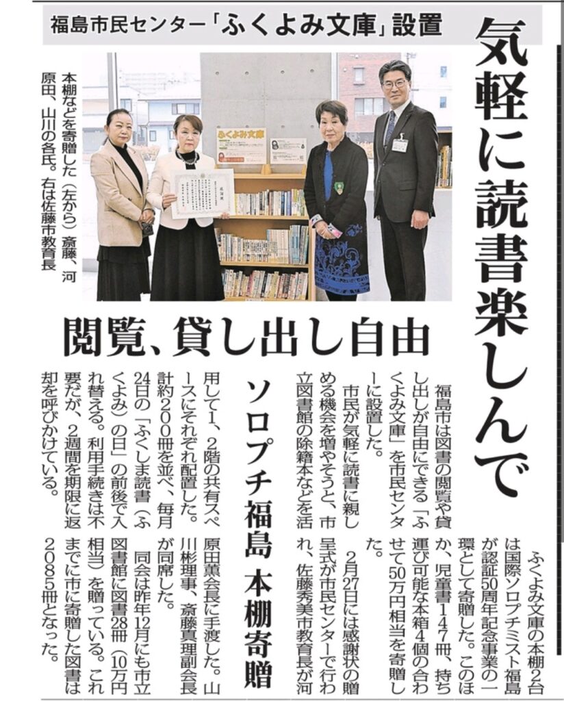 国際ソロプチミスト福島は認証50周年記念事業として、福島市民センターの自由に読書を楽しめる「ふくよみ文庫」に書架と児童書を寄贈しました。この事業では専用本棚2台、移動式木箱4個、および児童書147冊(50万円相当)を寄贈。市立図書館の除籍本を活用し、居住地を問わず手続き不要で閲覧、貸出ができる利便性の高い環境充実に寄与しました。2月27日の贈呈式で河原田会長が佐藤教育長より感謝状をいただきました。これまでの累計寄贈図書は2085冊になりました。今後も継続事業として毎年読書機会の創出を支援してまいります