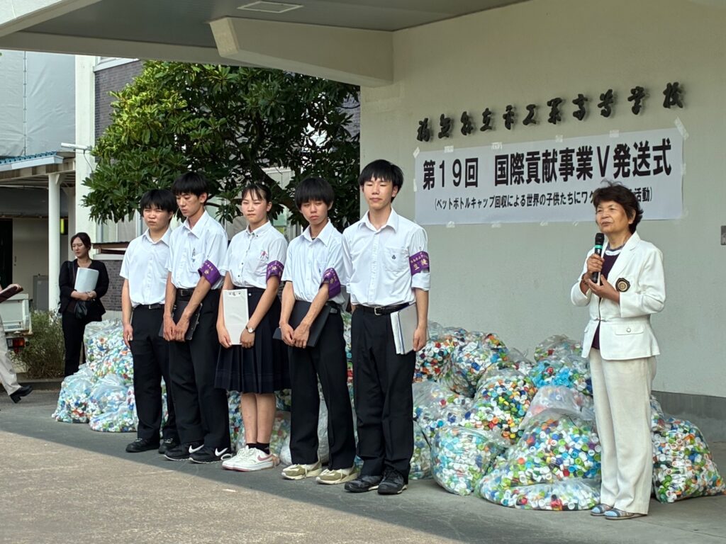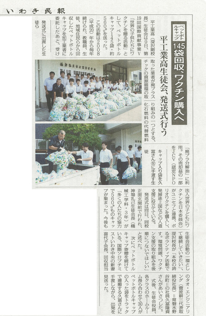 福島県立平工業高等学校は、生徒や地域住民から1年間集めたペットボトルキャップを市内で再資源を行っている会社に寄贈している。その活動に私達会員4名で9月25日に参加し、ペットボトルキャップ、プルタブ、インクカートリッジを1年間集めた物を高等学校に寄贈を行った。この収益は、世界の子どもにポリオワクチンを贈る活動に取り組んでいるNPO法人へ寄付する事になっている。