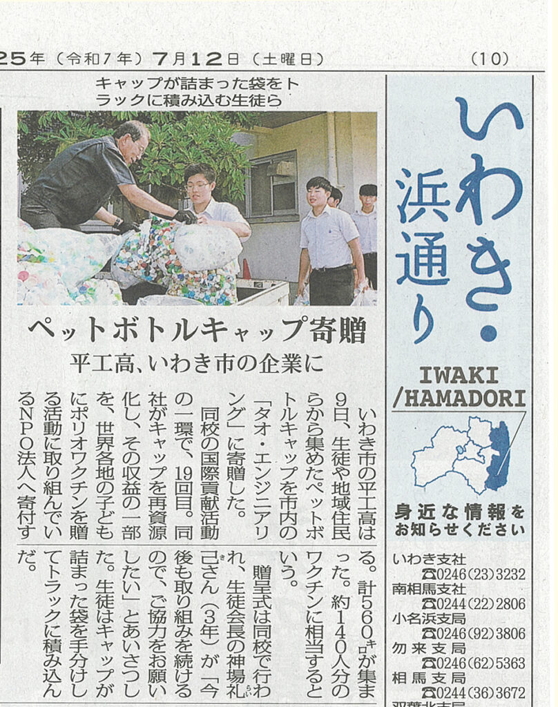 2025年7月10日(木)14時より、福島県立平工業高等学校生徒会主催、ペットボトルキャップ発送式に会長はじめ4名が参加。国際貢献事業として、発展途上国の子どもたちへのポリオワクチンになるペットボトルキャップを回収。今年で19回目の発送式。地域の協力もあり、全体で560kg。我がクラブも約100kgのキャップ他、空き缶のプルタブ・使用済みのインクカートリッジなども持参。これからも長く続けてほしいですし、我々も少しでも協力できたらと思います。