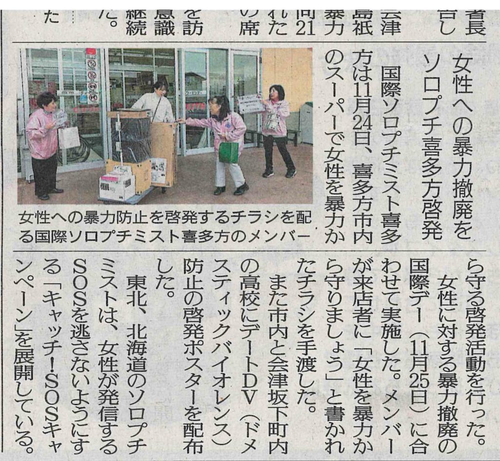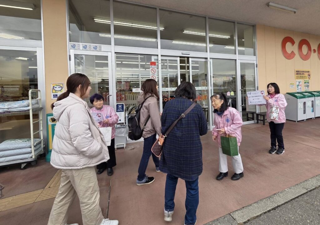 2025年11月24日 喜多方市内コープひがし店!店頭に於いて暴力撤廃国際デーにちなみDV防止のポスターを揚げて“暴力から脱出する勇気を持ちましょう”と言葉や連絡先を書いたカード入りテッシュペーパーを来店客に配った。チラシだけでなくティッシュペーパーは皆さんに受け取って頂きました。