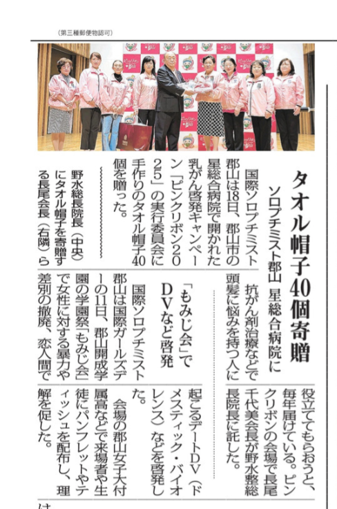10月18日、郡山市星総合病院で開かれました乳がん啓発キャンペーン「ピンクリボン2025」の実行委員会に手作りタオル帽子40個を贈りました。
