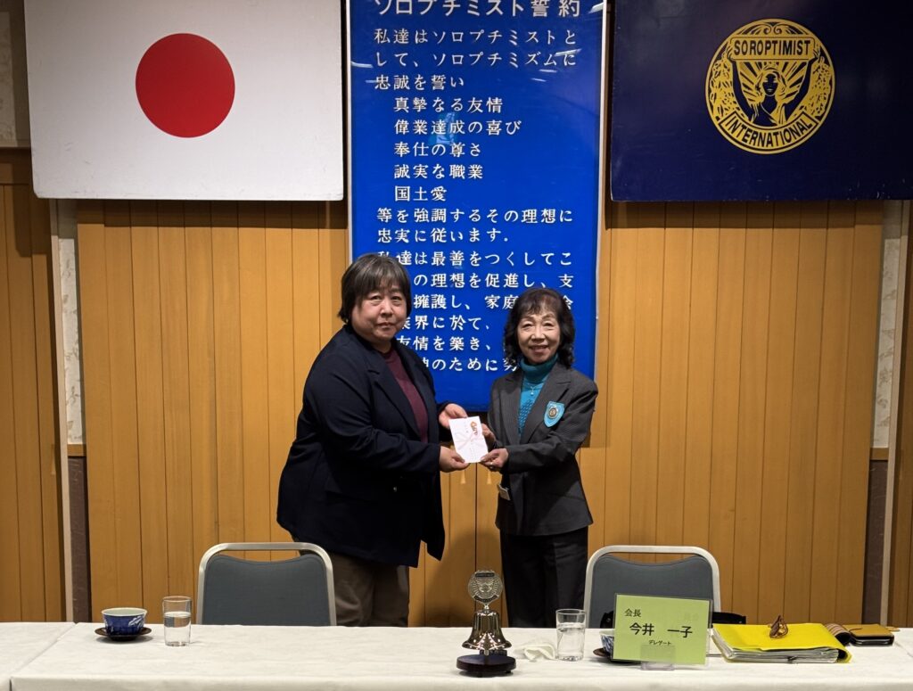 ソロプチミスト日本財団“社会ボランティア賞”に応募致しました「オホーツク助産師ネットワーク」は残念ながら受賞とはなりませんでしたが、11月例会へ助産師の上川晶恵様にお越しいただきクラブ賞贈呈式を執り行いました。無料で<子育てママのランチ会>を企画・運営され、助産師と看護師が直接母子と関わる中で、子供の発達面でのアドバイスや産後うつ等様々な不安や悩みの相談をされているそうです。この活動に微力ながらお役に立てればと思っております。会員9名出席
