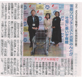 たくさんの方々からのご協力により回収されたリングプルが車椅子1台となり、認証25周年の節目に社会福祉協議会へ、会長・プログラム委員長・広報委員長3名で寄贈してきました。社会福祉協議会の事務局長はじめとする職員の方々に見守られる中、贈呈式を開いて下さり、車椅子は社会福祉協議会の中で活用させていただきますとの事でした。感謝状をいただき、3台目の寄贈に向けて頑張りたいと決意を新たにしました。今回、リングプル回収にもご協力いただいた地方誌伝書鳩に記事が掲載されたので、皆さんに周知されご協力いただけたらと期待してます。