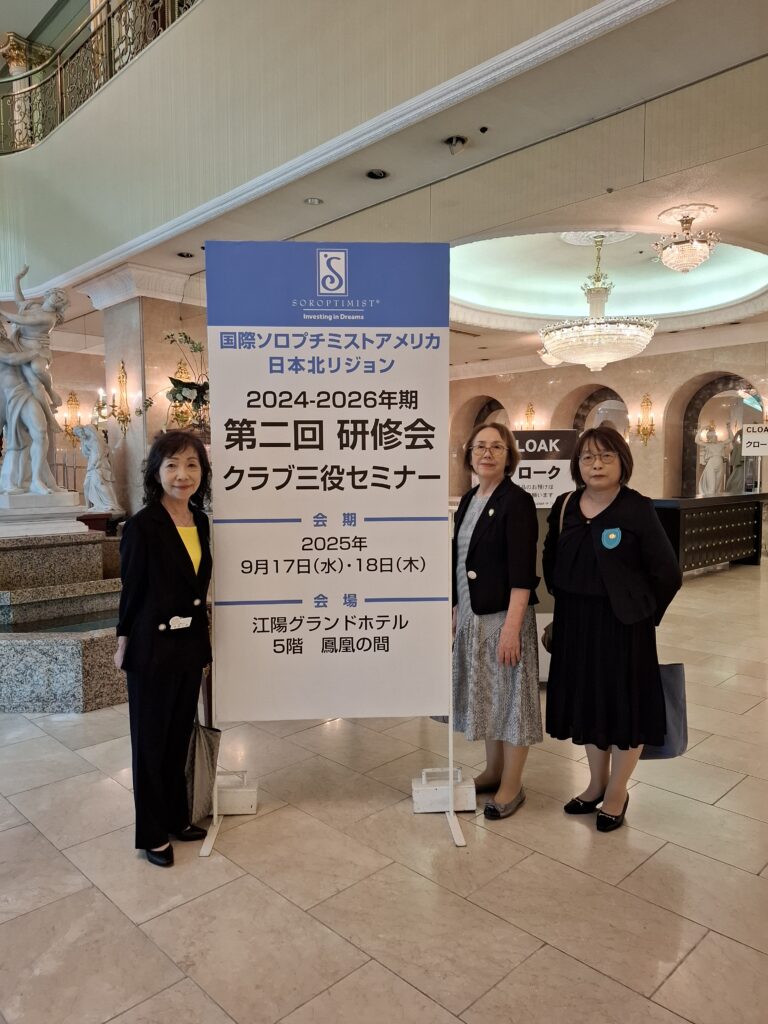 会長・セクレタリー・トレジャラー代理の3名で参加しました。アクティビティの「マシュマロ・チャレンジ」は、役割分担やコミュニケーションを図るゲームで各テーブル大変盛り上がり楽しかったです。グループトーキングでは、クラブの会員数が減少している中での奉仕活動に様々な工夫をされているお話に他人事ではないのだと改めて実感しました。今期はそのままの席での交流夕食会でしたが、他のクラブの方々とたくさんのお話が出来て良かったです。研修会も大変勉強になりとても有意義な二日間でした。