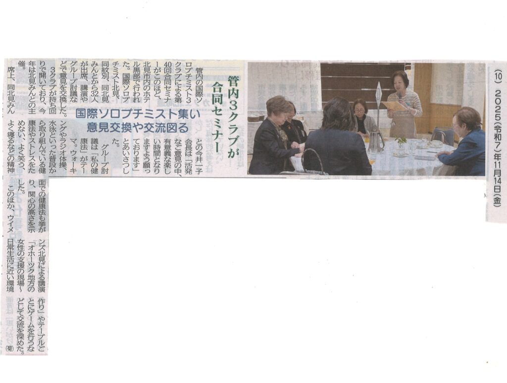 第40回3クラブ合同セミナーを北見みんと主催で行いました。SI北見様、SI紋別様、SI北見みんと総勢32名の参加でした。5つのグループに分かれて進められ、午後からのゲームで頭の回転を良くした流れでテーマ「私の健康法」でのグループ討議を行い、各会員の様々な健康法についての話しで大変盛り上がりをみせました。参加された会員の皆様のおかげでとても楽しく温かい3クラブ合同セミナーとなりました。時間が経ちましたが、地方紙伝書鳩にも掲載していただけました。