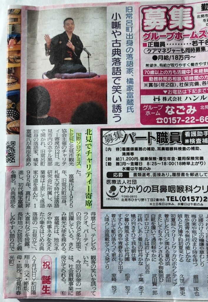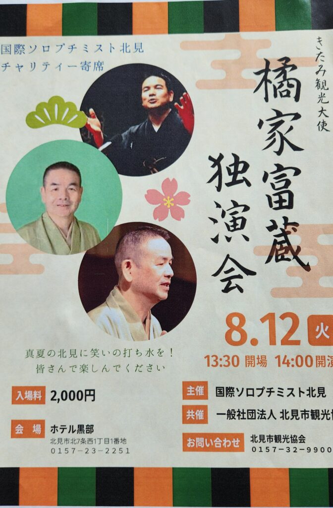 チャリティー寄席 2025.8.12 8/12(火)ホテル黒部にて北見出身の落語家「橘屋富蔵」氏が高座を務めるチャリティー寄席を開催しました。 参加人数:200名 収益金:約40万円 寄付先:ウイメンズ北見様