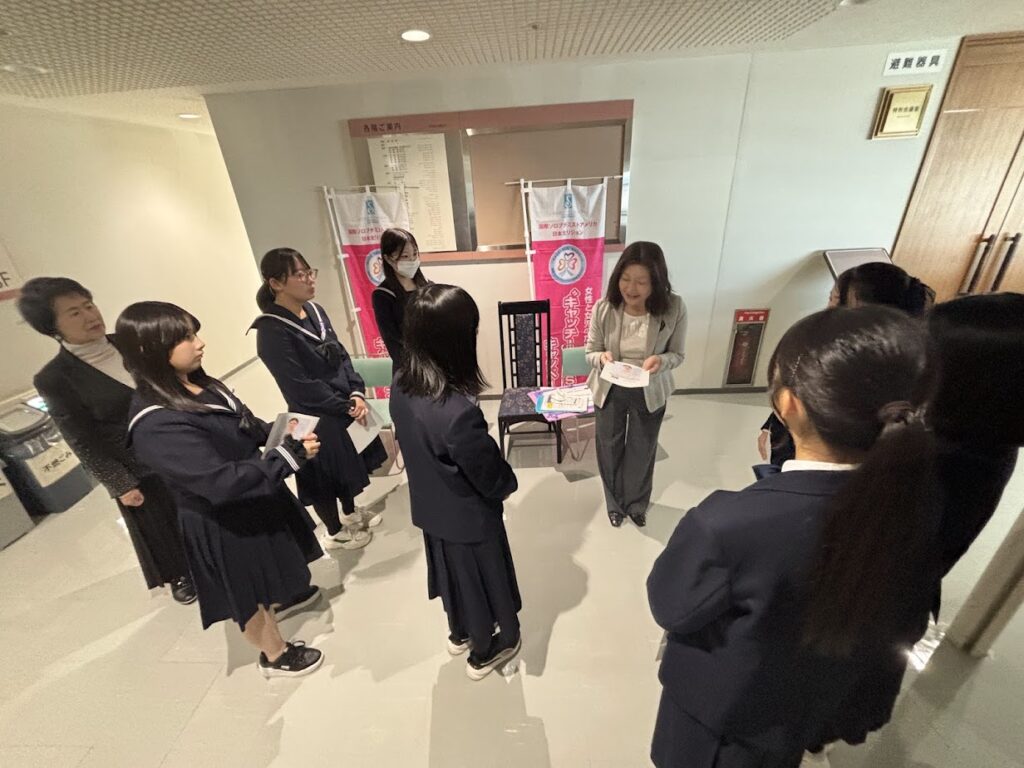 女性に対する暴力撤廃の国際デー 2025.10.25 夢を拓く:茶話会」で参加女子生徒と共にキャッチSOSキャンペーンを行いました。暴力撤廃の啓発チラシ配布と説明を行い、パープルリボン着用で写真を撮りました。暴力の恐ろしさを感じてくれたことと思います