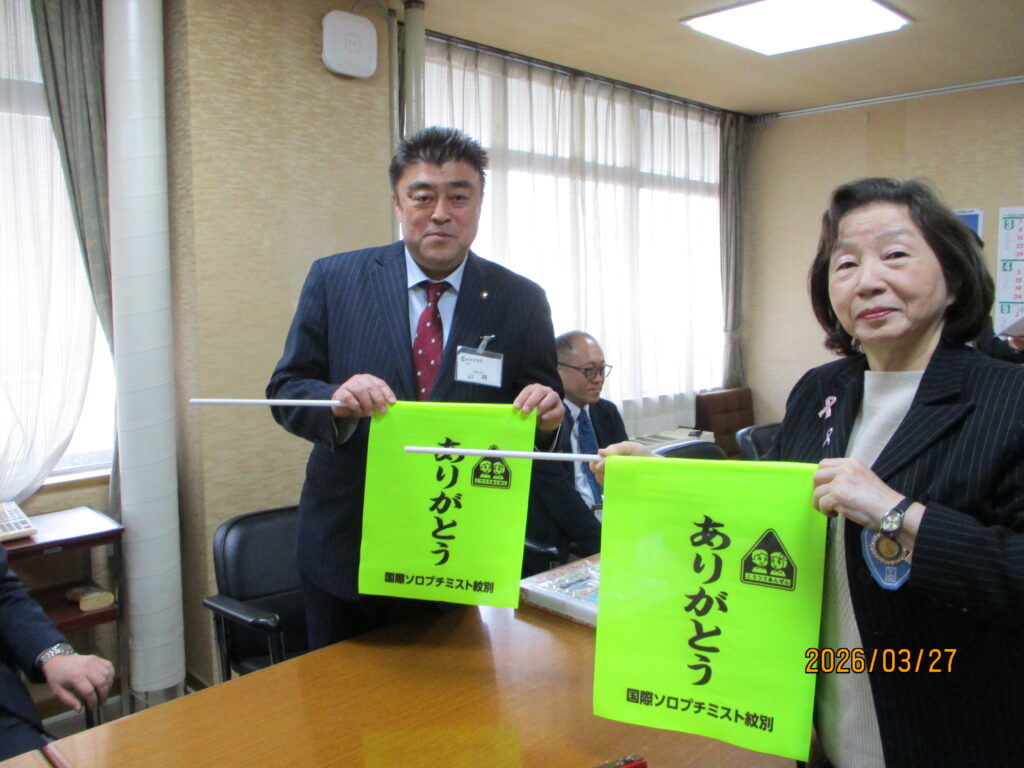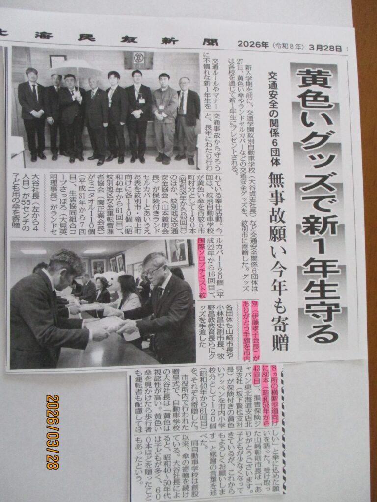 新入学児童用交通安全小旗寄贈 2026.3.27 新入学児童の交通安全の為に毎年恒例となっております、紋別市の贈呈式へ代表2名 で参加し80本を寄贈しました。黄色の旗を振って横断歩道を渡る子供たちの 姿に交通事故の無いよう、祈りを込めて送っております。