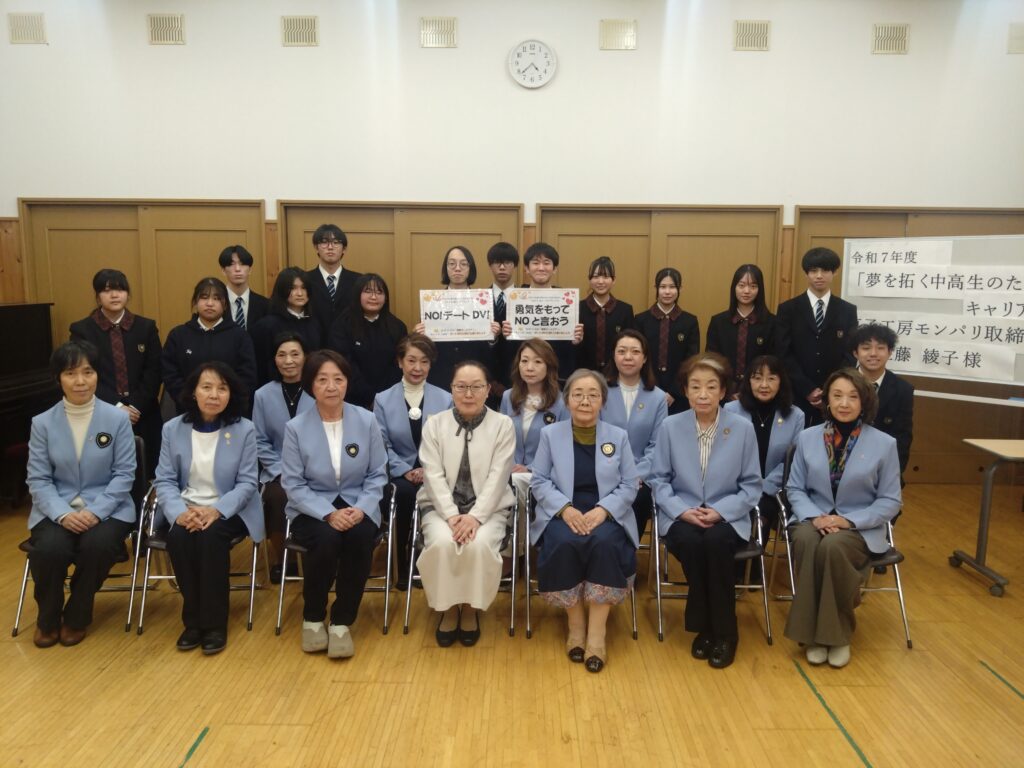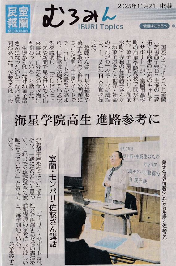 菓子工房モンパリ専務の佐藤綾子さんに「お菓子屋さんと世界・社会のつながり」をテーマにご講演頂きました。参加者は高校1~2年生で、女子6名、男子4名の計11名。自身の経歴や菓子の材料を取り巻く世界の問題(貧困国の児童労働問題など)について分かりやすく説明してくださいました。様々な経歴を持つ佐藤さんに生徒からは、「なぜお菓子屋さんを継いだのか」などの質問もあり、参加生徒は熱心に講演を聴いていました。当日会員は全員オレンジリボンを付けて参加し、高校生たちの明るい未来を願いました。