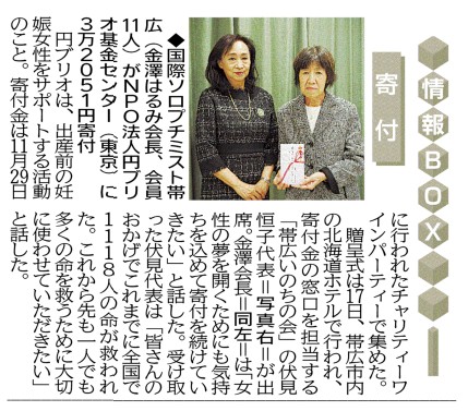 12月17日(水)例会開始時にNPO法人エンブリオ基金センターへの寄付金の贈呈式を行い窓口担当の「帯広いのちの会」伏見恒子代表に寄付金をお渡しました。この寄付金は、10月に開催したチャリティワインパーティ開催時に募ったエンブリオ募金です。 エンブリオ基金は、出産前の女性を支援する活動で、これまでに全国で1,118人の命が救われています。