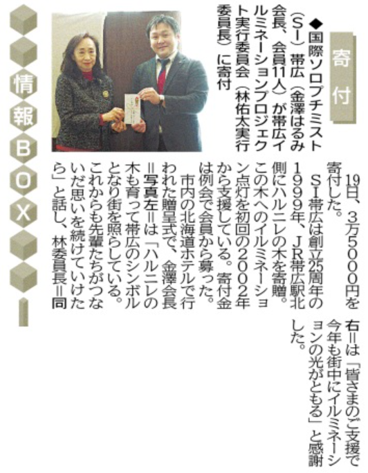 11月例会に北リジョンガバナー篠村千恵子様にご訪問頂き、国際ソロプチミストの歴史、活動についてのご講話があり、会員一同は多くの学びを得ることができました。例会開始前には、今年17年目となるハルニレの木点灯募金寄付の贈呈式も行い、篠村様にもご参加頂きました。 贈呈式には、帯広イルミネーションプロジェクト実行委員長林様他1名様、市役所商業労働室から2名様のご出席いただきました。