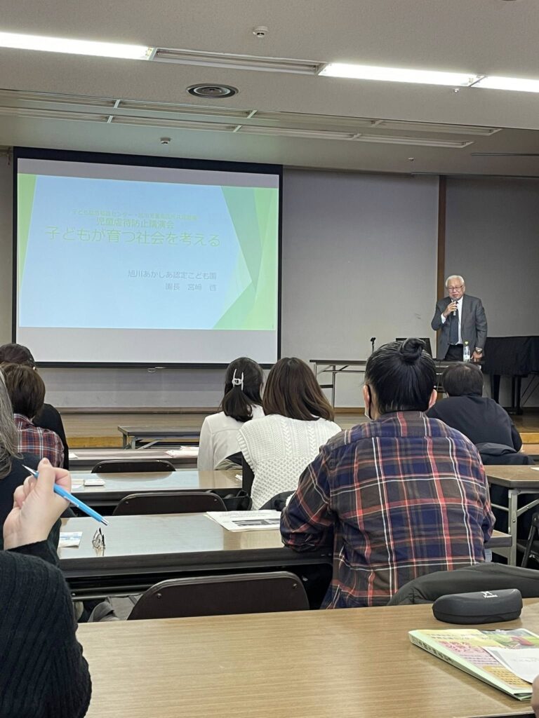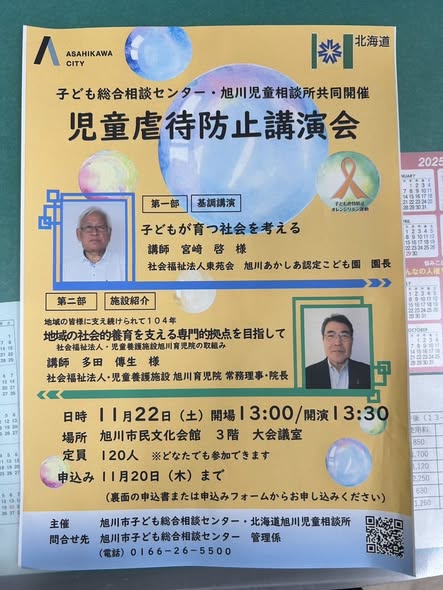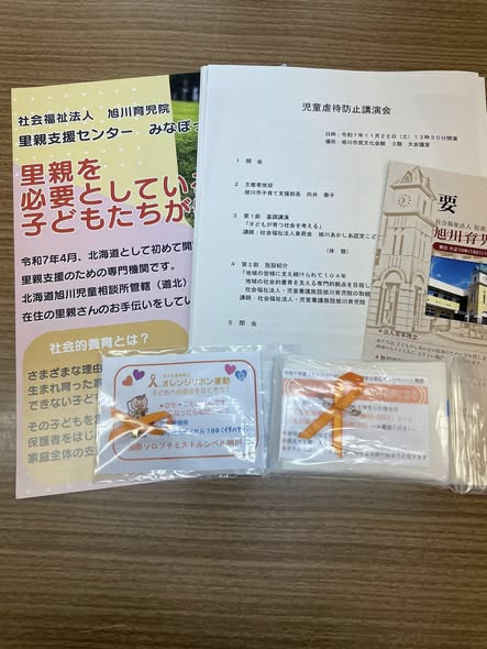 旭川市民文化会館3階大会議室で行われた「児童虐待防止講演会」に会長他3名で出席。11月の例会で袋詰め作業を行ったオレンジリボンを配布していただきました。旭川育児院の多田院長も「地域の社会的養育を支える専門的拠点を目指して」というテーマで旭川育児院の取り組みについてご講演されました。