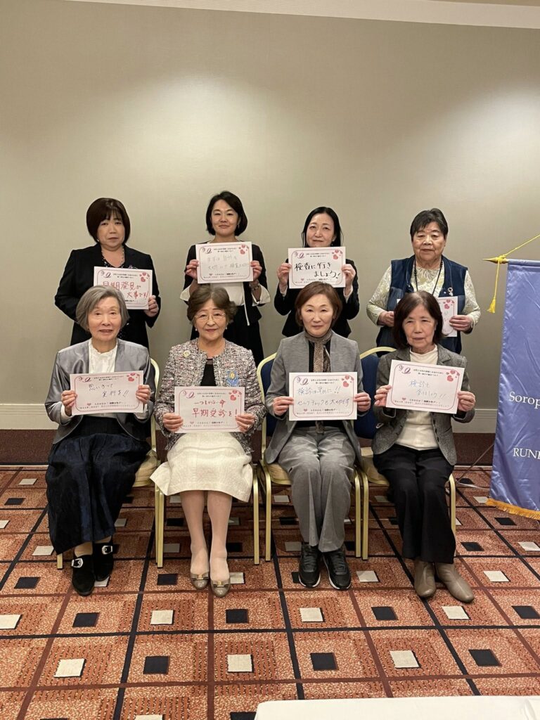 3月業務例会は篠村ガバナー公式訪問。篠村ガバナーにも国際女性デーのキャンペーンボードにご記入いただき一緒に写真を撮りました。