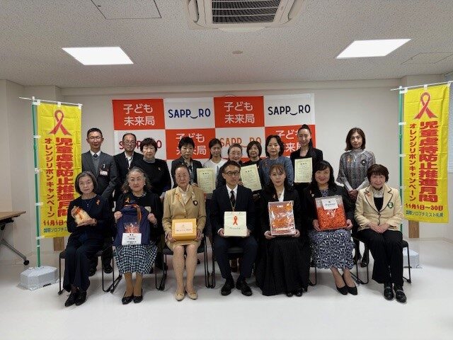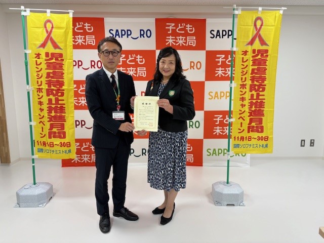 女性と女児の夢を実現するための児童虐待防止「キャッチ!SOSキャンペーン~11.25暴力撤廃への国際デー」に賛同して、オレンジリボン1250個オレンジリボン啓発ティッシュ2000個を作成贈呈しました。10月28日「札幌市へのオレンジリボン贈呈式」に参加、4クラブ等(SI札幌・SI札幌中央・SI札幌グローリア・SI札幌ノイエ・杏花会)の合同活動継続にあたり札幌市より感謝状をいただきました。贈呈式は9月白石区に開設しました新たな札幌市東部児童相談所で行われ、あわせて児童相談所の施設見学にご案内いただきました。またJR札幌駅構内で街頭啓発オレンジリボン及びポケットティッシュが配布されました。