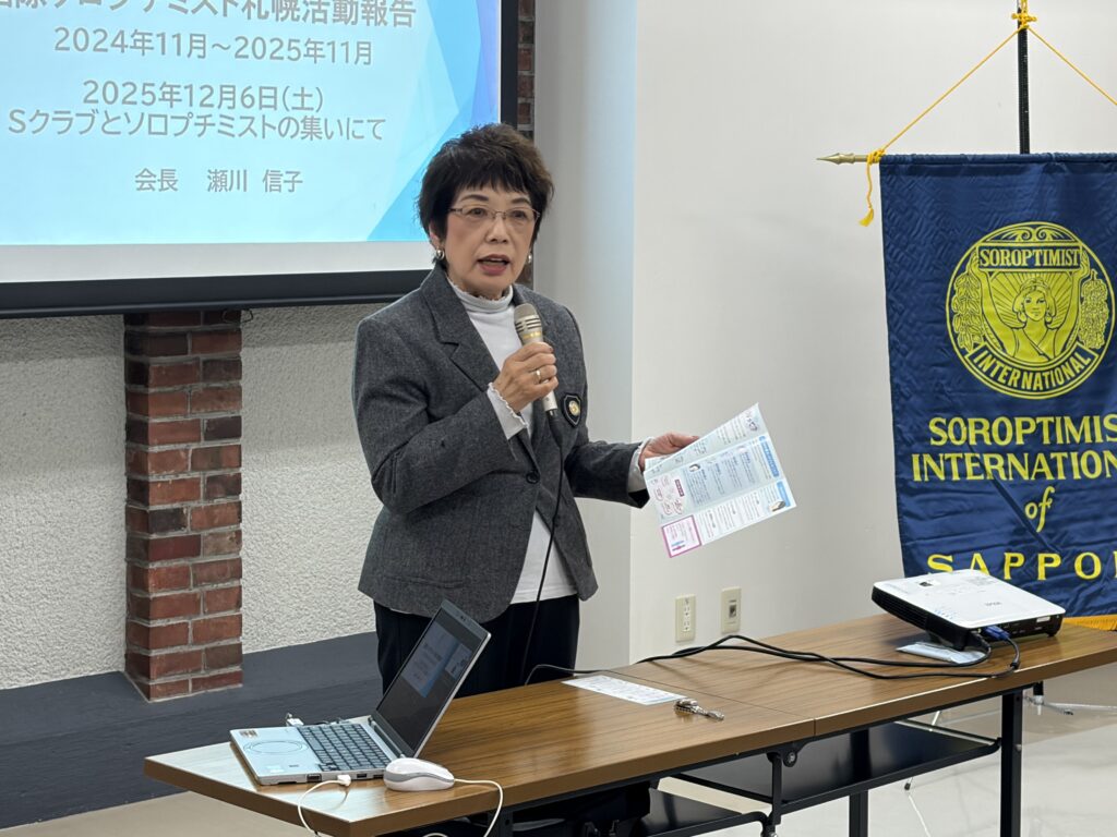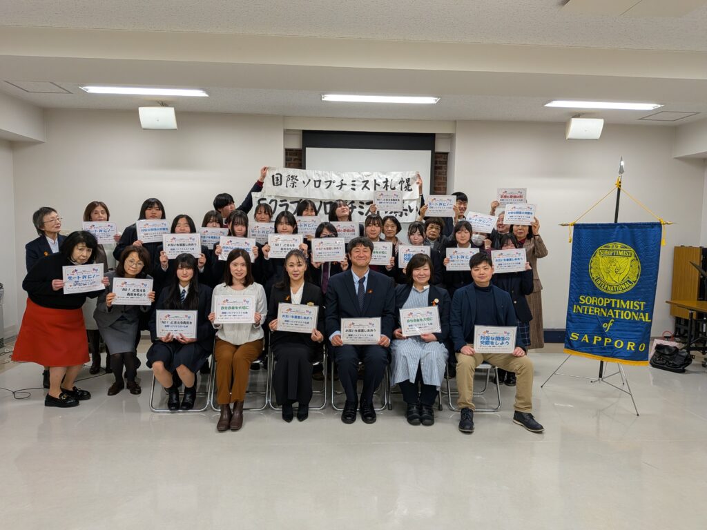 国際ガールズデー 2025.12.6 「Sクラブとソロプチミストの集い」(市立札幌藻岩高校、札幌龍谷学園高校)で札幌市作製のデートDVについてのリーフを配布し、篠田会員が講話しました。そして参加者29名でキャンペーンボードを掲げ、アピールしました。