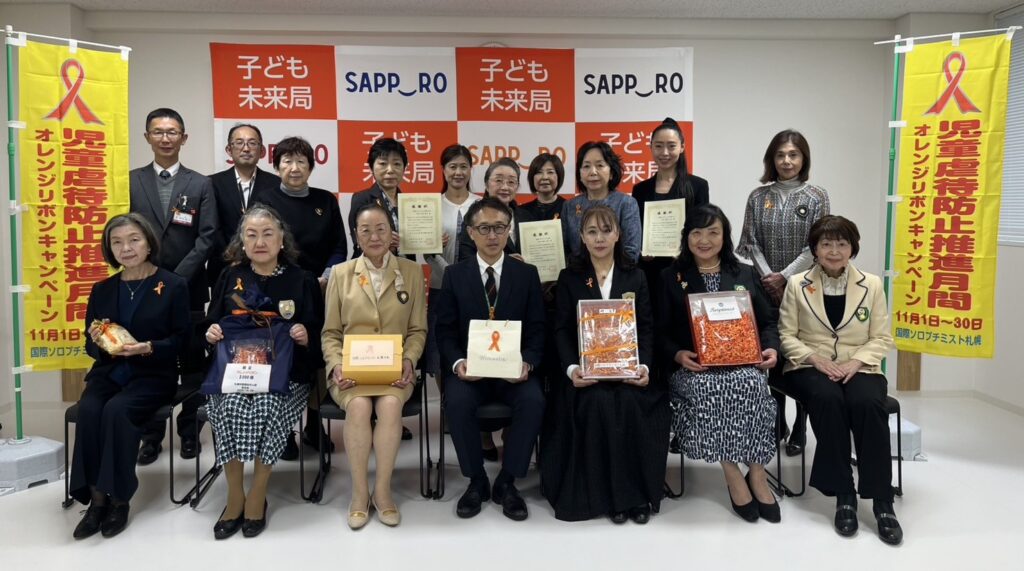 10月28日(火)、会員手作りのオレンジリボンと啓発用ポケットティッシュを、札幌市と北海道に贈呈しました。札幌市へは、市内3クラブおよび、札幌市医師会夫人部杏花会と合同でリボ7,000個、ティッシュ8000個です。贈呈式は、9月に白石区に誕生した、札幌市東部児童相談所で施設見学も兼ねて行われました。東部児相の担当区域は白石、厚別、豊平、清田の4区で、面談室や心理検査室、司法面接室などは、子どものプライバシーと権利擁護への配慮がなされ、また、一時保護の子ども達が思い切り体を動かせる、広い体育館もありました。北海道への贈呈は、SI札幌単独で北海道庁で行い、リボン2,000個、ティッシュ5,000個をお届けしました。