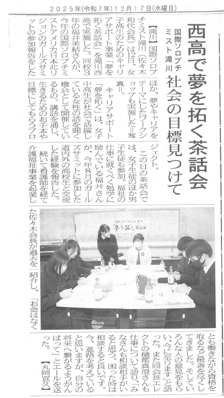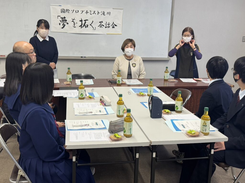 女子高生のためのキャリアサポート「夢を拓く」茶話会を12月12日に開催。参加人数生徒4人会員4人と今回は少人数での茶話会となった。高校の推薦入学手続きの最中で参加生徒を募集することが困難の中、男子生徒2名も参加し、担当の川人先生のご尽力開催することができました。今回の茶話会は8月に開催されたガールズサミットに参加した福井美結さんの体験を発表してもらい、その後のワークショップにて社会に出るための目標を見つけるにはどうしたらよいかなど話し合った。会員の体験談なども交え、生徒の皆さんが、困難に直面したときには必ず相談するとよいとアドバイスし、将来のキャリアにつながるよう話し合った。1時間と制限のある茶話会でしたが、生徒の皆さんにエールを送ることができたと感じた。