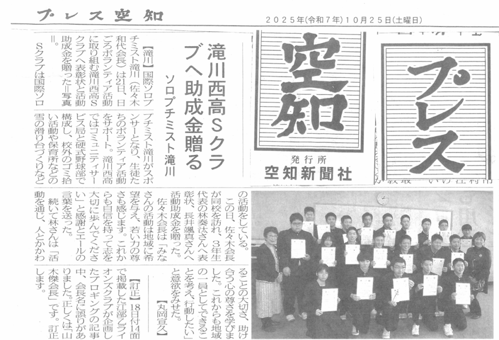 ボランティア活動に取り組む滝川西高Sクラブへ、表彰状と活動助成金を贈呈した。このSクラブは、滝川西高コミュニテークラブと硬式野球部の生徒が会員となっており、主な活動として、校外でのごみ拾いや、保育所での雪の滑り台作り、除雪作業などを行っている。こうしたボランティア活動に対し、生徒たちが地域に希望を与えるとともに、奉仕の尊さを称えるため、毎年Sクラブ会員全員に対し、SI滝川より感謝とエールを込めた表彰状と活動助成金が贈られている。生徒たちは活動を通して、人と関わることの大切さや助け合う心の尊さを学んでおり、「これからも奉仕の心を持ち続けたい」と話していた。