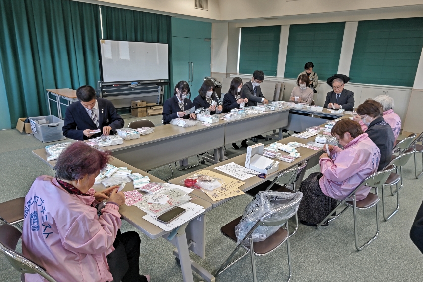 事前に当日配る資料をポケットティッシュと共に袋詰め作業をした