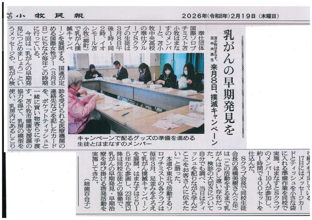 Sクラブの苫小牧中央高校の生徒・先生9名、はまなす会員7名、市役所保健師1名にて お店を訪れる方々に手渡し検診の大切さを伝えました。