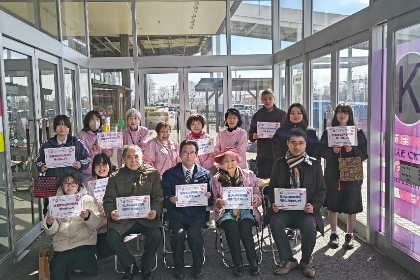 Sクラブの苫小牧中央高校の生徒・先生9名、はまなす会員7名、市役所保健師1名にて お店を訪れる方々に手渡し検診の大切さを伝えました。