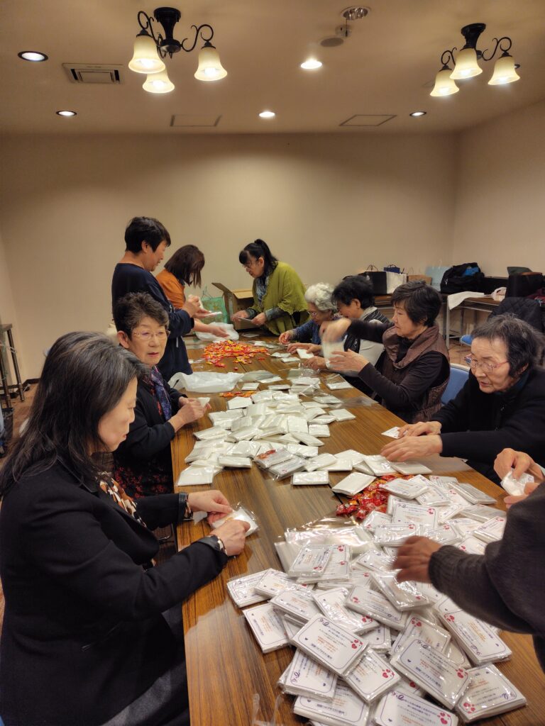 11月の業務例会後、全員で児童虐待防止キャンペーン(オレンジリボン)の啓発に使うカード・飴・ティッシュの袋詰め、そして女性に対する暴力根絶運動(パープルリボン)の啓発のための袋詰め作業を行いました。皆で取り組んだのでオレンジリボン230個パープルリボン250個が一時間かからず完成しました。