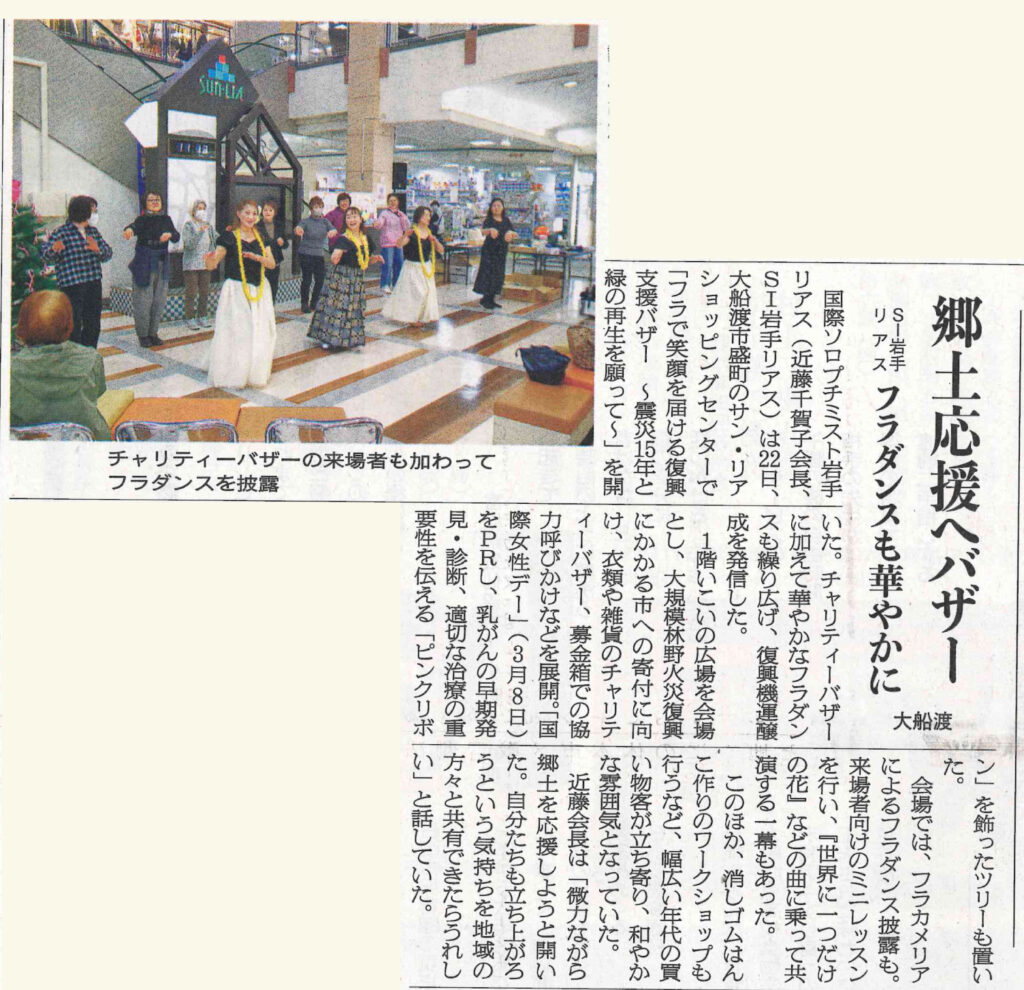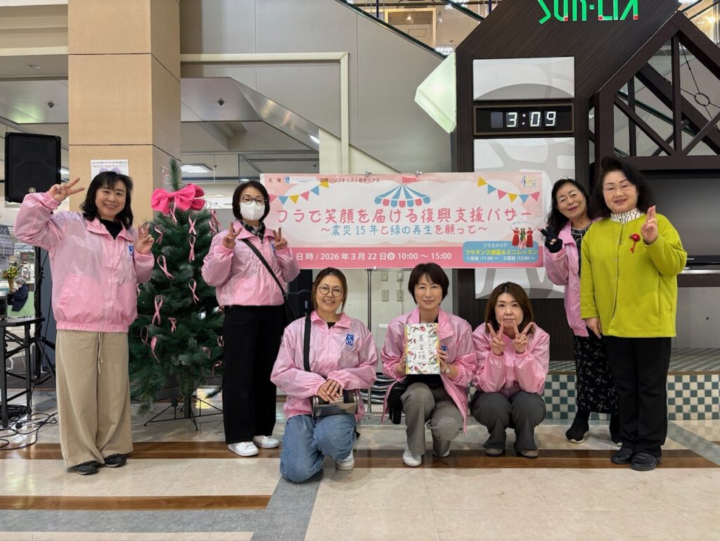 国際女性デー 2026.3.22 3月8日の国際女性デーに合わせ、サンリアでピンクリボン運動とチャリティバザーを開催。乳がん早期発見の重要性を伝えるため、相談先を記載したティッシュを配布し、多くの来場者に啓発しました。