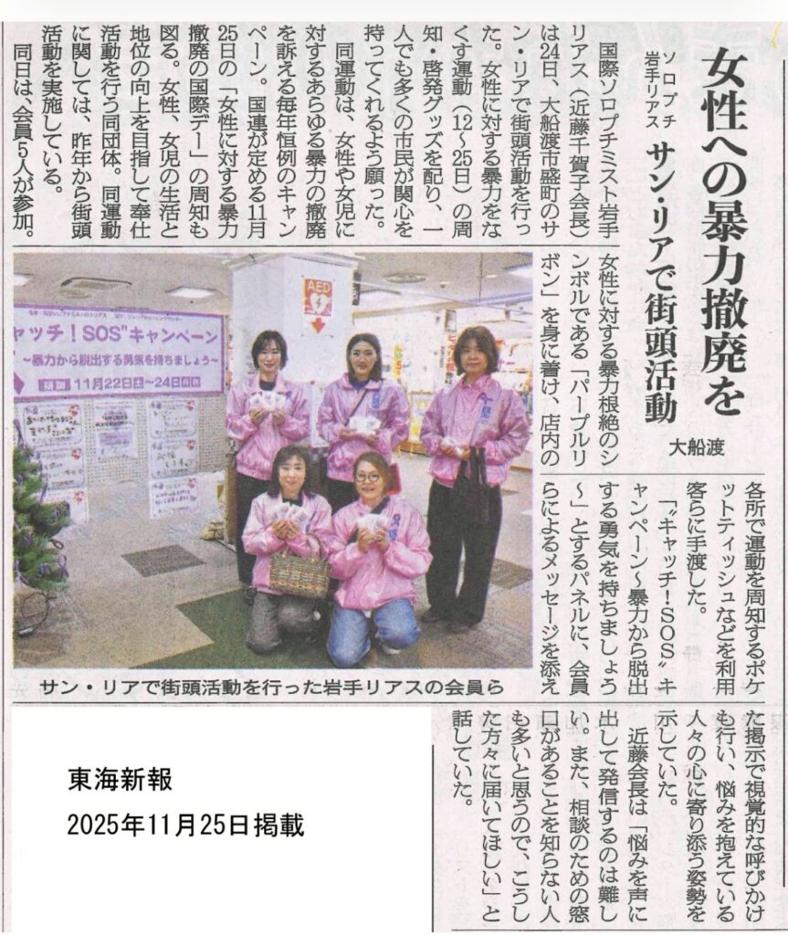 女性に対する暴力撤廃の国際デー 2025.11.24 サン・リア様のご協力で、22~24日に「女性に対する暴力をなくす運動」として、パープルリボンツリーとメッセージを掲示し、24日には相談窓口入りティッシュを配布しました。