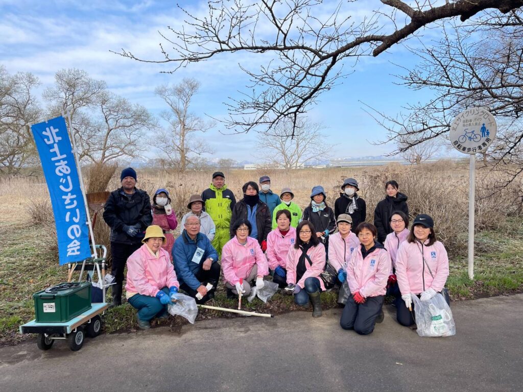 北上展勝地にて「北上あじさいの会」の皆様とともにボランティア活動を行いました。地域の方々との初めての協働活動となり、揃いのピンクジャンパーがまるで桜のように映え、和やかな雰囲気の中で作業を進めました。当日は肌寒さもありましたが、会員同士の交流や地域の皆様とのふれあいにより寒さも忘れ、楽しく充実した時間となりました。