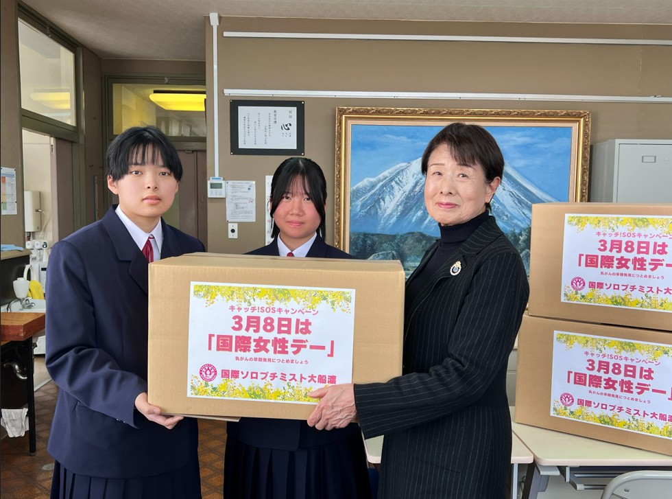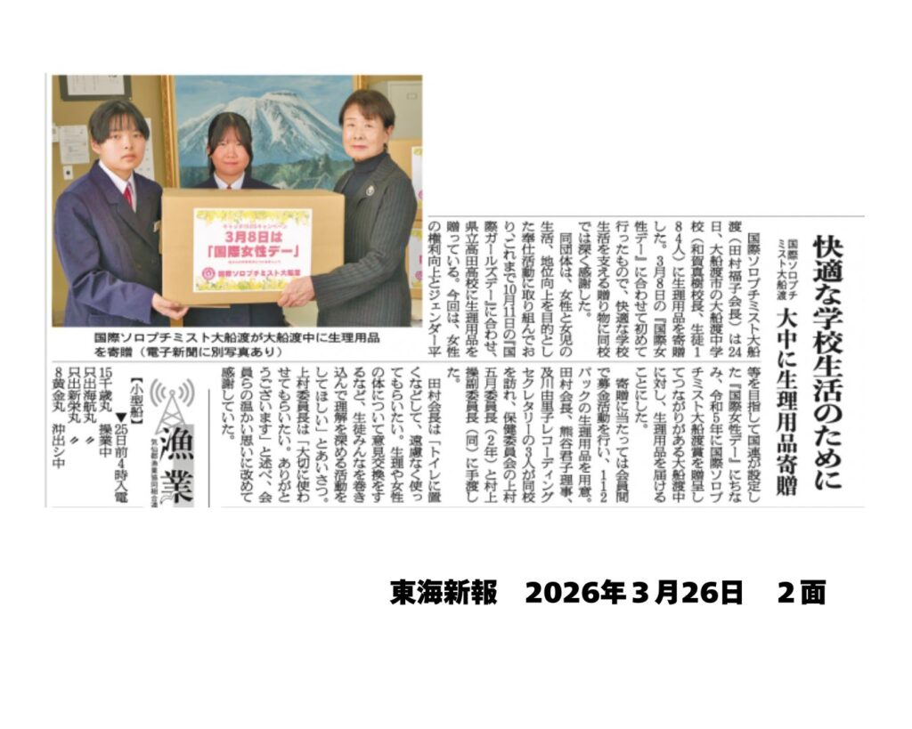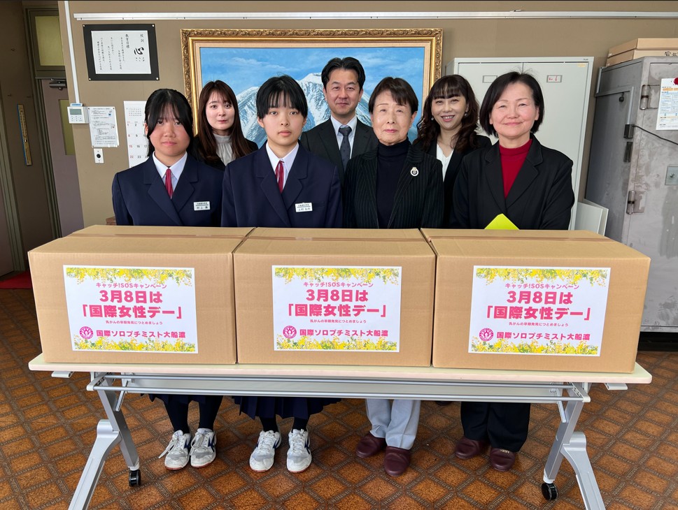 国際女性デー 2026.3.24 3月24日、国際ソロプチミスト大船渡は、国際ガールズ・デーに合わせ大船渡市立大船渡中学校へ生理用品を寄贈しました。女子生徒の安心につなげる取り組みとして、今後も女性と女児の支援活動を続けてまいります。