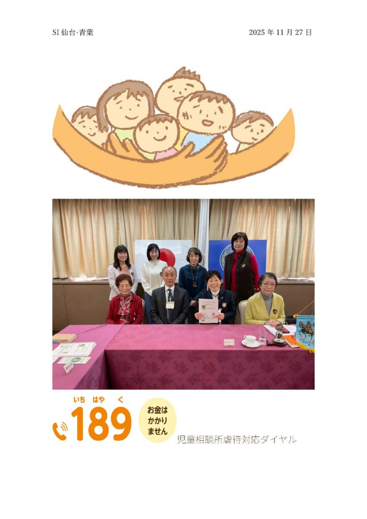 オレンジリボン活動運動の一環で、「仙台市児童相談所長」大久忠氏をお迎えして仙台市の現状、 1、児童相談所の業務 2、児童虐待について 3、児童虐待の防止のために 4,一時保護所の生活についてと内容を細かく説明していただきました。現在仙台市の施設には幼児含め30名の子供達が生活しているそうです。そこに関わる職員がおおよそ180名と言う人数にも驚きましたが、様々な事情で相談所での生活を余儀なくされる子供達が増えていることも事実です。昨今隣人でも他人のことに口を出す、助言すること自体が難しい時代ですが、問題が深刻化する前に早期発見、早期対応が大事であることを今一度考えさせられました。
