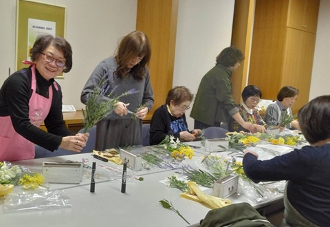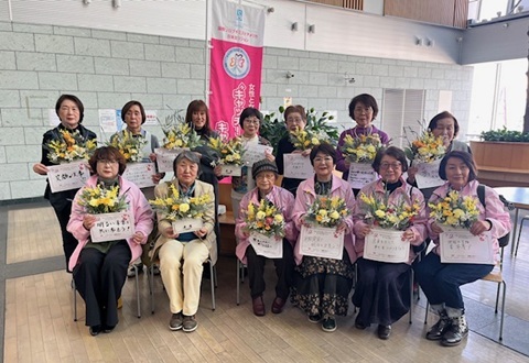 “キャッチ!SOS”キャンペーン「国際女性デー」2026.3.14 国際女性デー、ミモザの日に合わせ会員17名、乳がん患者の会スマイルあっぷる会員とフラワーアレンジメントを作成しました。バザーで集めたピンクリボン募金を贈呈し市役所広場でキャンペーンボードを掲げ啓発活動を行いました。