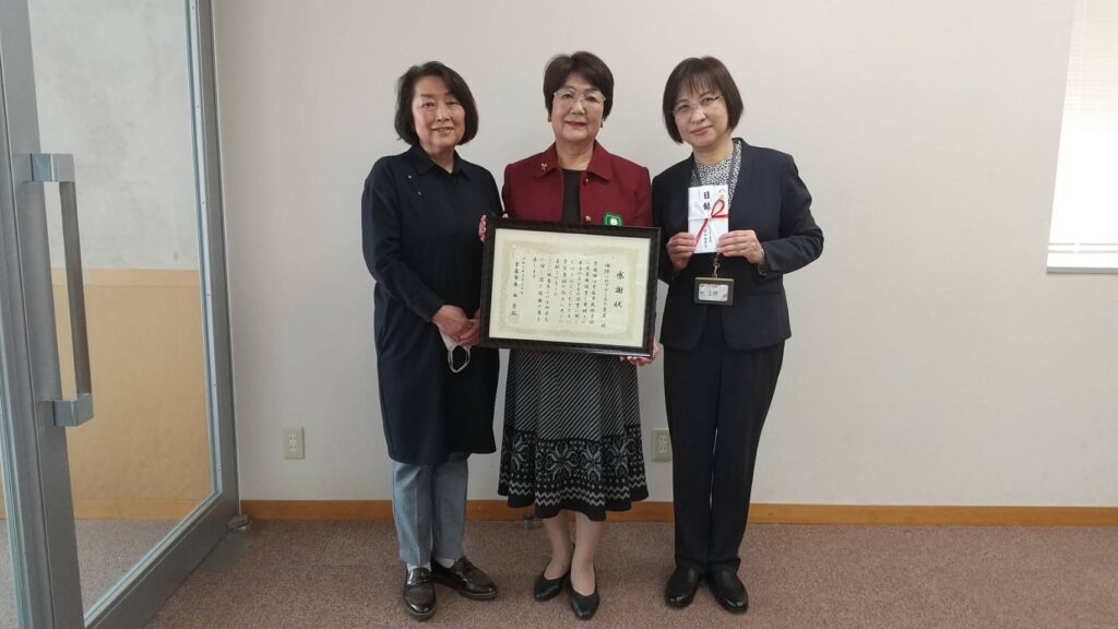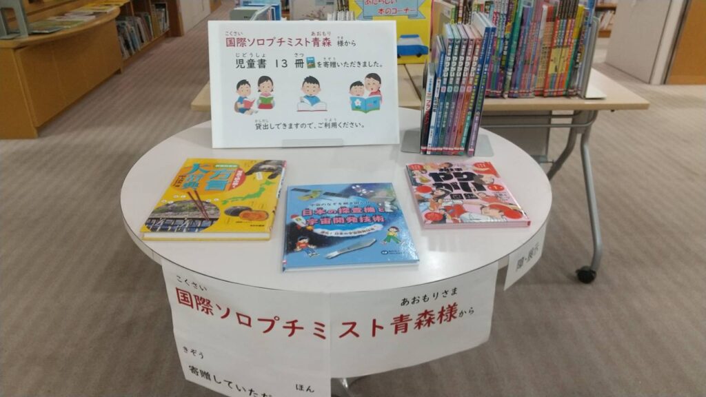 3月30日、青森市民図書館にて児童図書目録贈呈式が行われました。当クラブは今年で26回目324万円相当の児童図書を寄贈しています。図書館長さんより「寄贈の児童図書は、勉強にも役立ち日常生活での疑問や知的好奇心を満たすことが出来る本を中心に選書され感謝いたします」とのお言葉をいただきました。贈呈図書は、「知って役立つ記号図鑑・教科書に出てくる科学の記号・宇宙のなぞを解き明かせ!」など13冊納入されました。納入後、早速お借りした小学生もいたという吉報に心が弾みました。ライブラリー入り口には「国際ソロプチミスト青森様より寄贈」と表示板があり、当クラブの活動が青森市民の皆さんに幅広くPRされております。