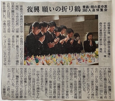 3月11日、‶S”クラブの青森明の星中学高等学校の東日本大震災15周年追悼集会に会員7名で出席しました。教職員代表、生徒会長、SI青森会長3名が共同祈願を読み上げ、地震発生時の午後2時46分に全校生徒と黙とうしました。当日は小雪が舞い、あの日の寒かった事や大災害を振り返りました。改めて自然災害の恐ろしさを思い起こし犠牲者と被災者に祈りを捧げました。