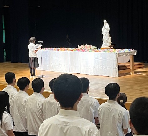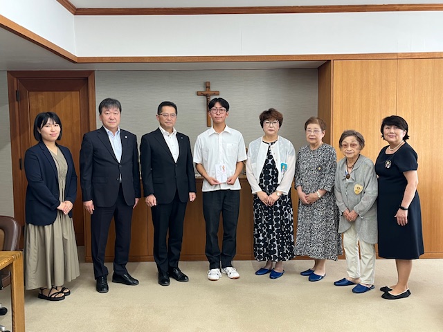 9月11日 ‶S″クラブ青森明の星短中学・高等学校を訪問し助成金を贈呈しました。当校のメディアやホームページ、SNSをとおして広く発信している事に触れ、また地域やグローバルな視点でのボランティア活動に励んでいる姿に共感し支持していると伝えました。生徒を代表してボランティア委員長が助成金を受け取り、活動報告とお礼の言葉をいただきました。この日は世界同時多発テロの発生した日で当校の「世界の平和を願う集い」に参加しました。世界で起きている災害や戦争などにより犠牲になられた方々への祈りを捧げる集会です。被爆地長崎からお越しの20代の語り部のお話を傾聴し平和を祈りました。