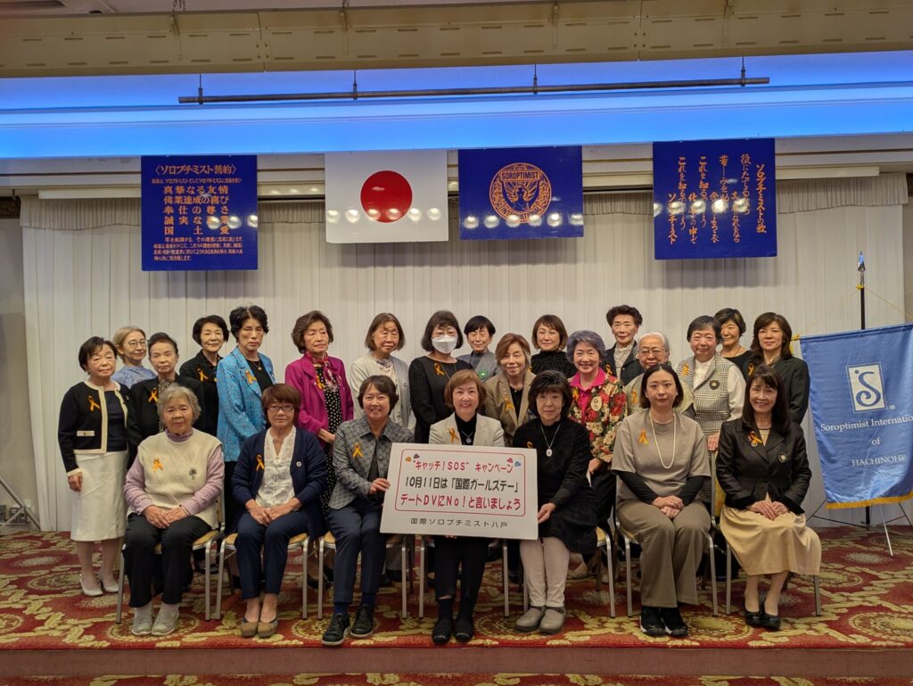 “キャッチ!SOS”キャンペーン「国際ガールズデー」 2025.10.16 SI八戸は、10月16日開催の10月業務例会開始前に、キャッチ!SOSキャンペーン「国際ガールズデ―」活動の一環として、ボードを掲げて集合写真を撮りました。特に今年は全員がオレンジリボンを胸に掲げ、児童虐待防止呼びかけに参加しました。