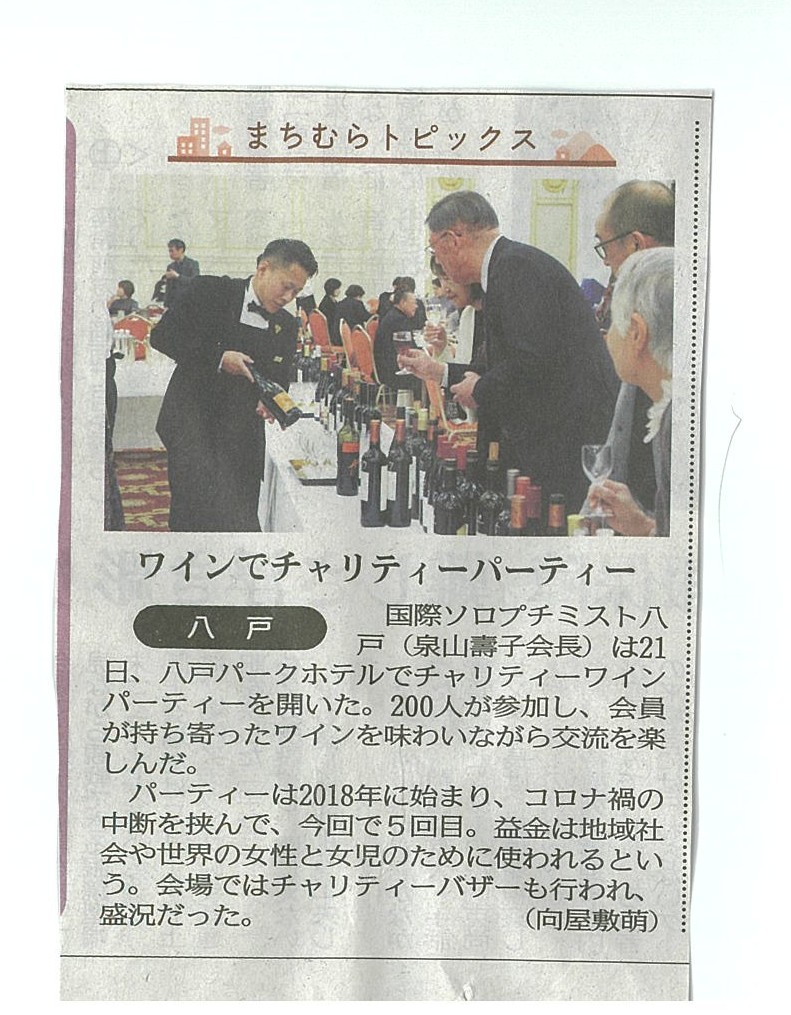 SI八戸は恒例の第5回チャリティーワインパーティーを去る11月21日に八戸パークホテルで開催しました。当日お集まりの約200名の来場者はフラ、ピアノ演奏と共に、会員が持ち寄ったワインなどで楽しい時間を過ごし、お楽しみ抽選会ではひと際盛り上がりを見せました。なお、会場時間前にロビーでクラブの広報パネルを掲示したり、キャッチ!SOSのポケットティッシュも配布し、私たちの活動もPRしました。
