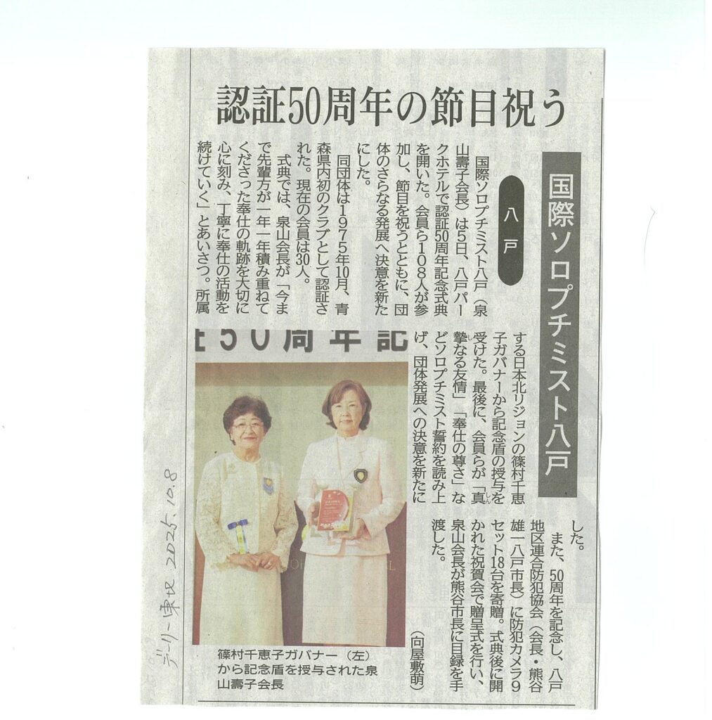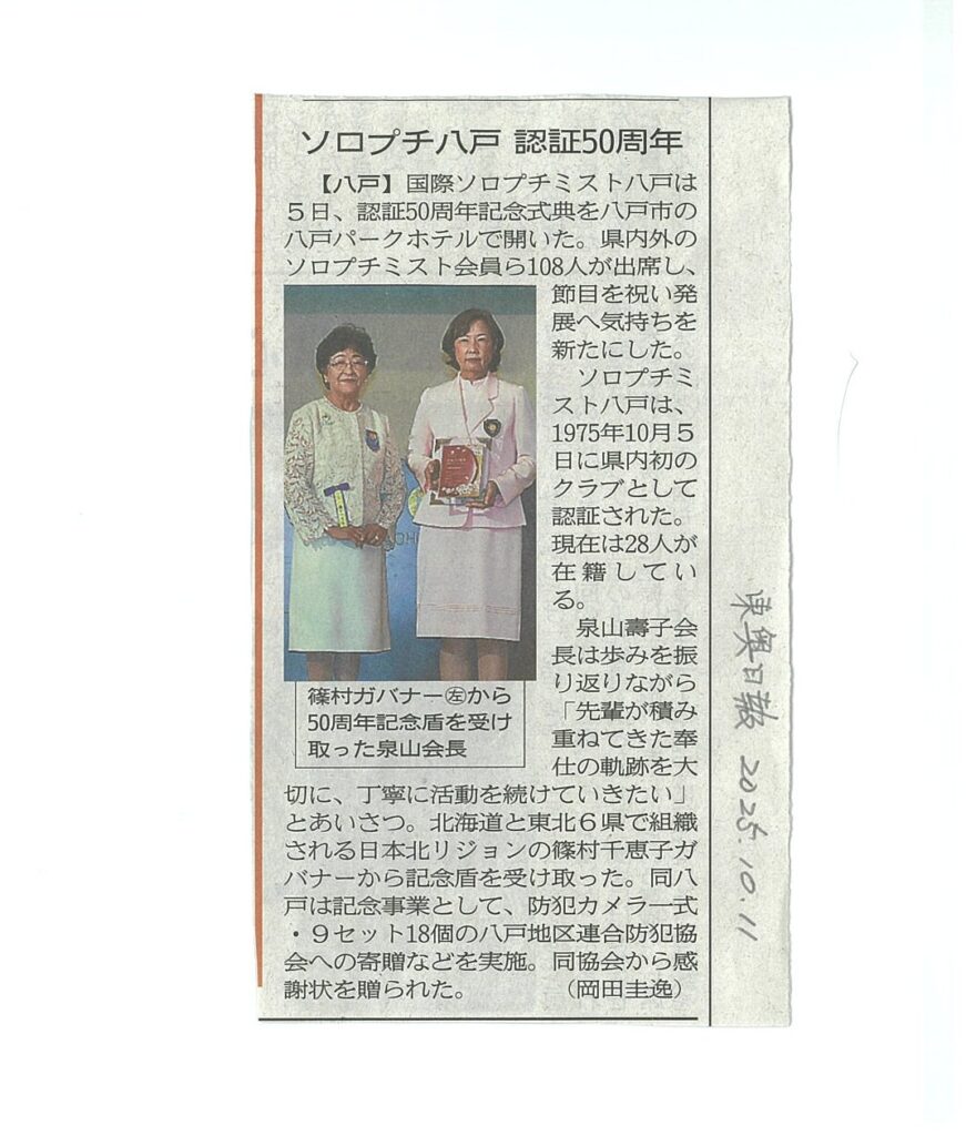 SI八戸は10月5日に認証50周年記念式典・祝賀会を行いました。 ガバナー、リジョン理事会、歴代ガバナー、リジョン委員、姉妹クラブの皆々様、縁あってスポンサーさせて頂いた新潟クラブの皆様、八戸市長はじめ市内からのご来賓など100名を超える皆様方に見守られ、誕生日を迎えることができ、会員一同心より感謝申し上げます。先達の築いてこられた歴史の重みを感じつつも、未来への扉を開き、新しいことにも勇気をもって挑戦し、活動していきたいと思っていますのでどうぞよろしくお願いいたします。記念事業として八戸地区連合防犯協会に防犯カメラ9セットを寄贈し、贈呈式も行いました。