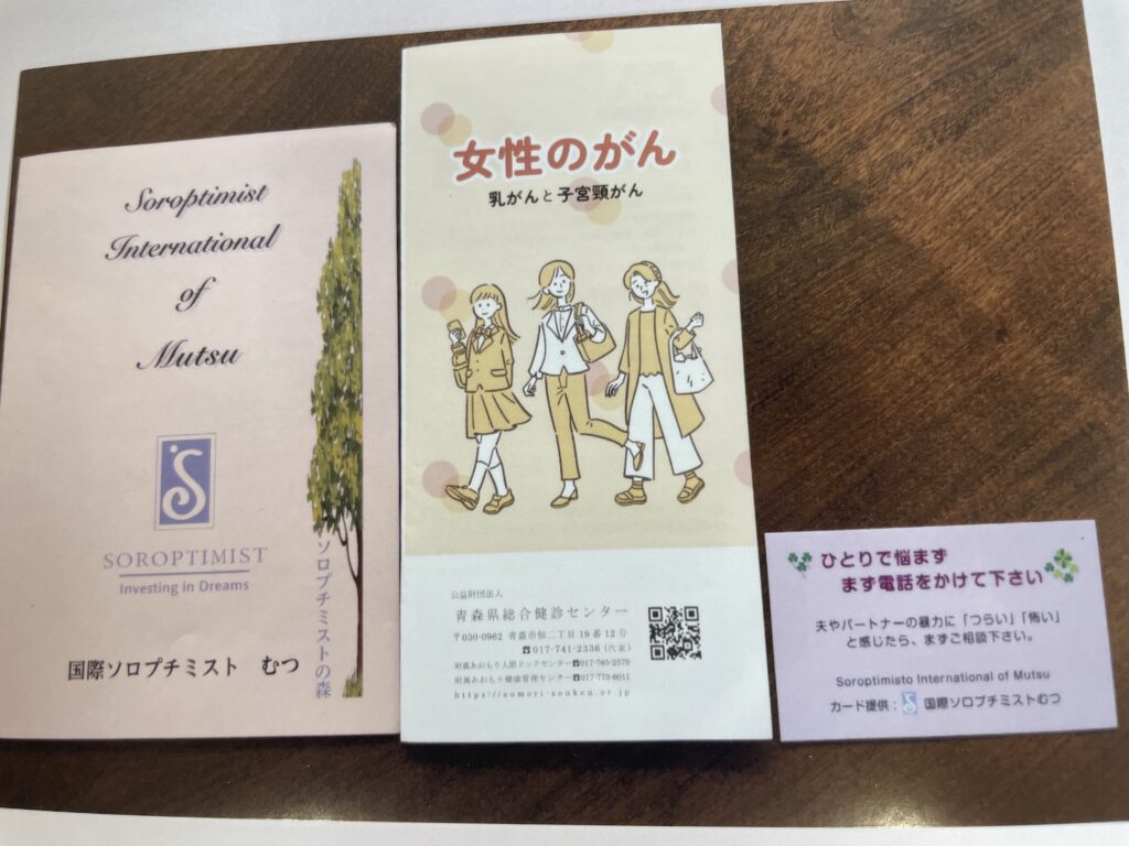 “キャッチ!SOS”キャンペーン「国際女性デー」 2026.3.14 毎年むつ市の図書館で開かれているコンサートの開催前にむつクラブ会長が挨拶の中で、当クラブの活動、国際女性デーについて説明し、80名近くの来場者の方々に女性のガンに関するパンフレット、DVカード、むつクラブのしおりなどを配布しました。